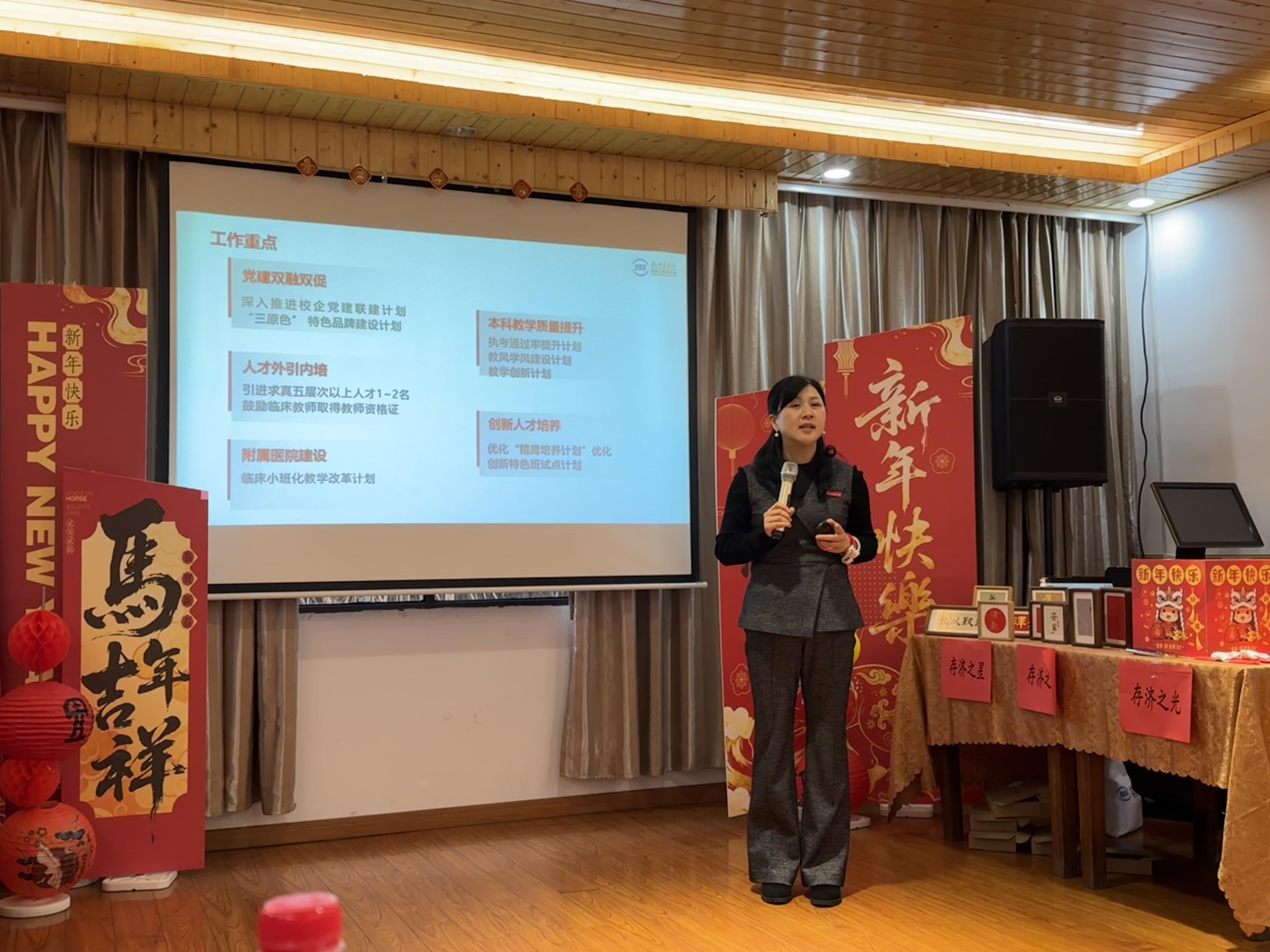 随后,学院党总支副书记孙晶珂讲述了2026年党建和学生工作上的新方向和新举措,提出要着力培养具有存济辨识度的口腔学子,为学院的发展注入新的活力。副院长姬海莲则对全体教职工一年来的辛勤付出表示衷心感谢,并鼓励大家继续团结奋进,为培养更多优秀的口腔医学人才贡献力量。